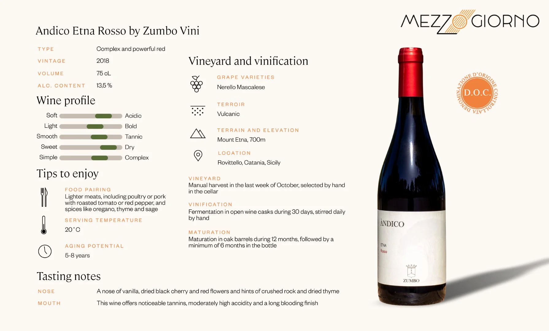 The result is a floral and spicy wine with a nose of vanilla, black cherry and red flowers. On the palate, this wine has a balanced taste with hints of oriental spices and aromatic plants with a clear mineral aftertaste as one would expect from a wine from Etna. This wine is perfect with red meat and game. Compared to Manata from Zumbo, which is made from the same grapes, Àndico is more complex, with more spices and more wood.