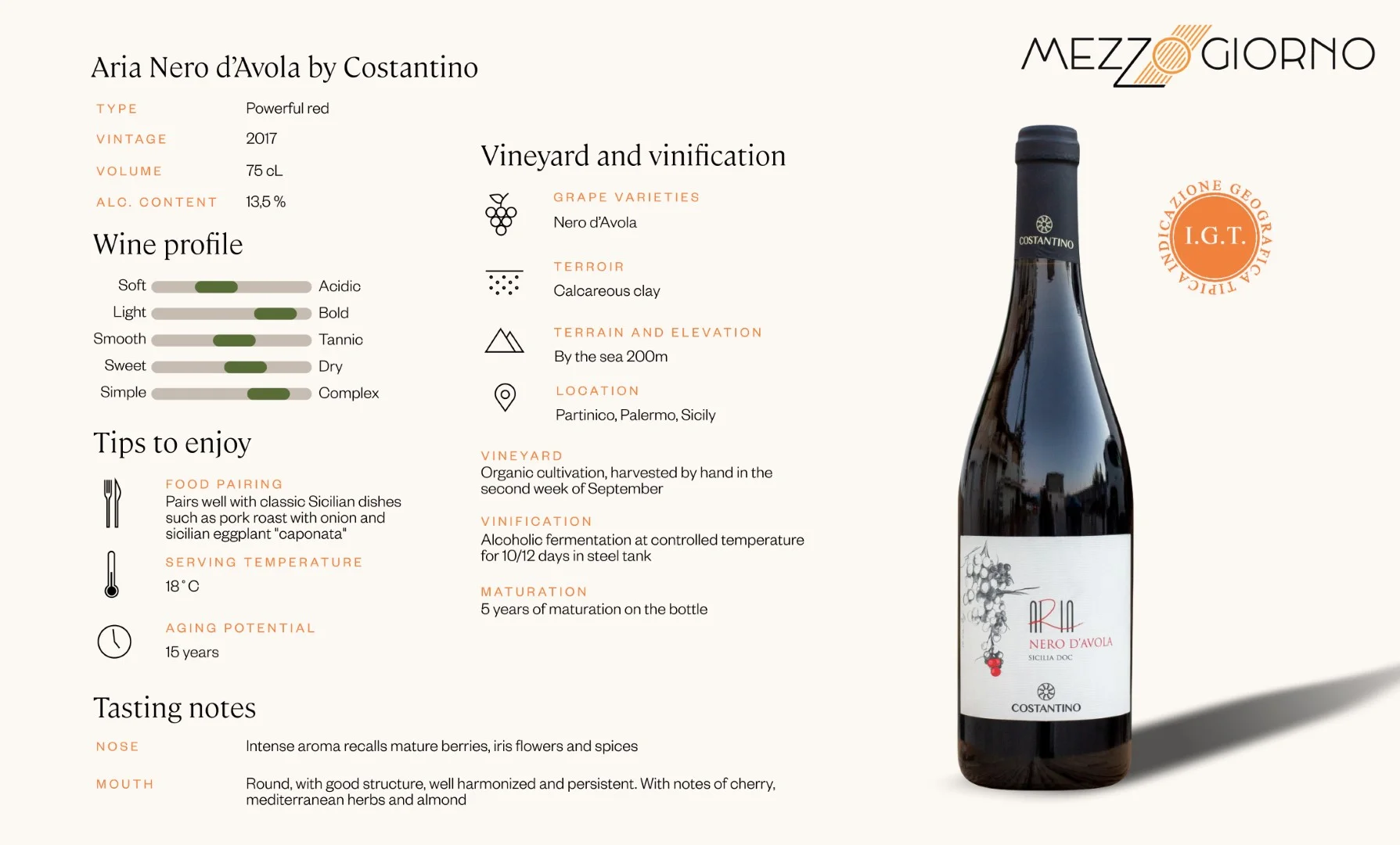 Costantino's Nero d'Avola is slightly spicy and has the characteristic scent of red fruit. The wine has clear notes of almond and cherry, with Mediterranean herbs. Drink this wine with beef stew or meat from the BBQ. Let the wine breath for some time before serving. This wine is also suitable to leave in the cellar for a few more years.