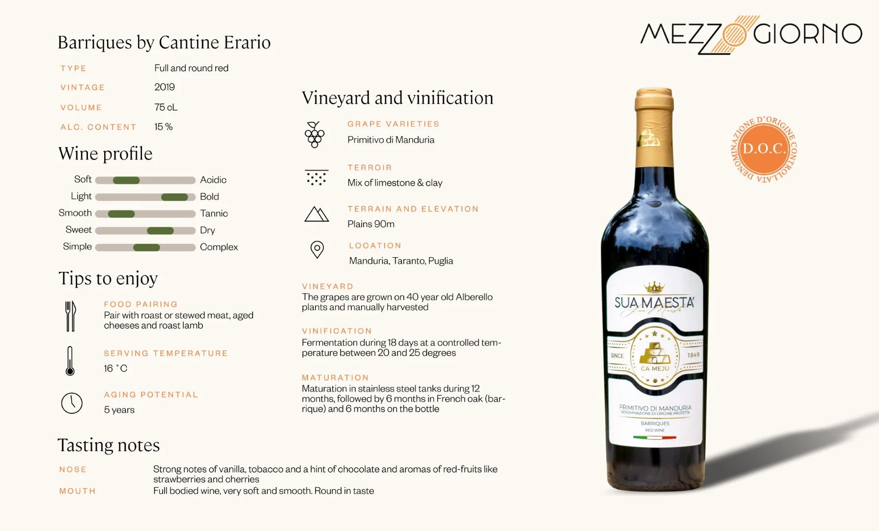 This Primitivo di Manduria DOC – Barrique is grown on 40 years old Alberello vines: free-standing, little trees instead of hanging plants in rows like we see in most vineyards. 3000 years ago, this was the way to cultivate grapes. Today, it is still practiced in very specific places. The method is less efficient, but with Alberello the grapes are sheltered from direct sunlight by the canopy of the small tree. In sun-drenched Puglia this is not a luxury. By protecting the berries against scorching and premature ripening, the grapes are given more time to form sugars. This allows Erario to achieve higher alcohol content during the fermentation process, resulting in a full, structured wine.