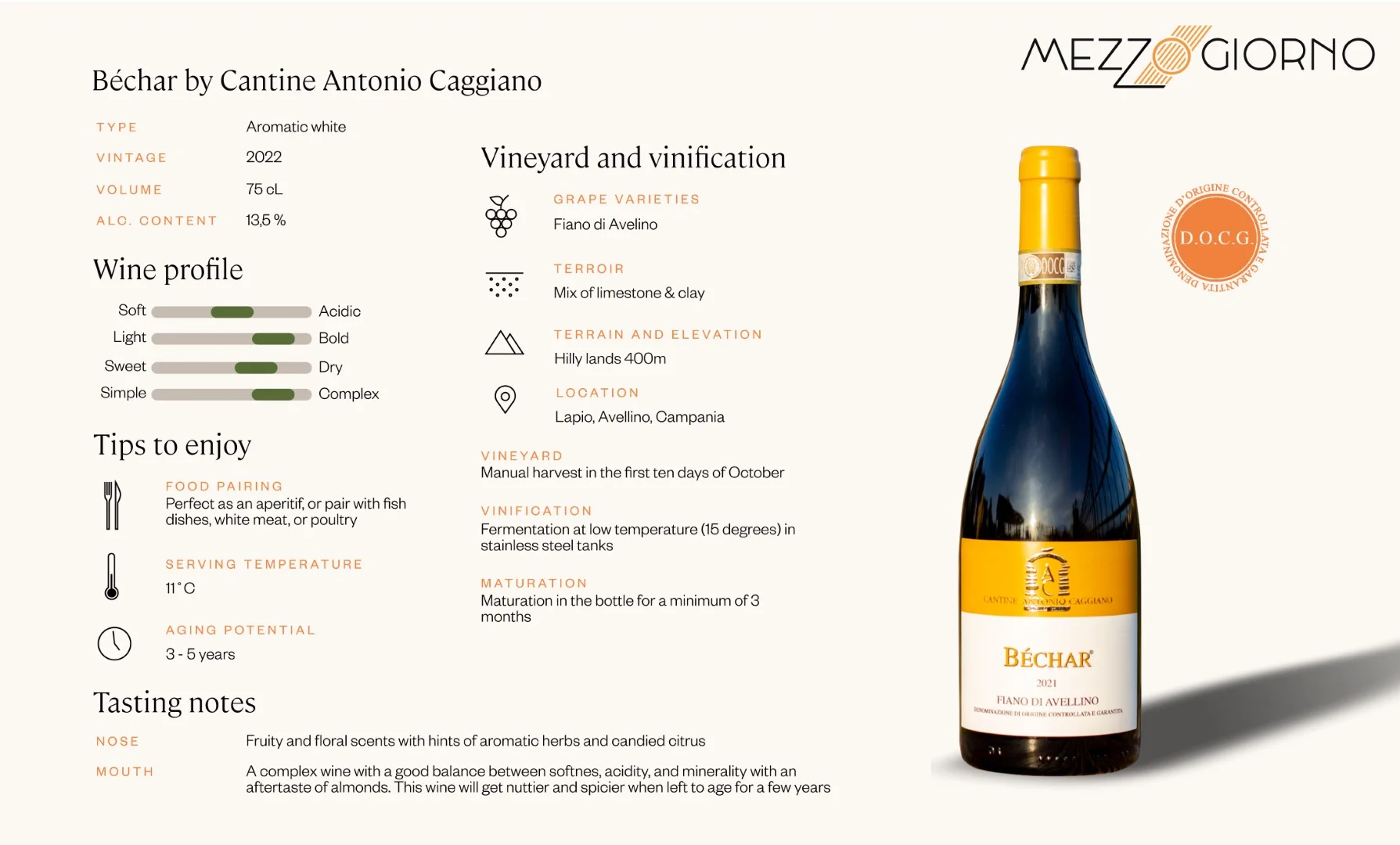This wine lets you enjoy life like the Romans did 2000 years ago. Bechar, a floral wine with aromas of candied citrus and spices, balanced by a pleasant minerality thanks to the volcanic terroir. This special wine will get even better you will leave it for another few years, during which the palate will develop a stronger nutty and spicy taste. This Fiano is ideal in combination with fish dishes, white meat, or poultry.