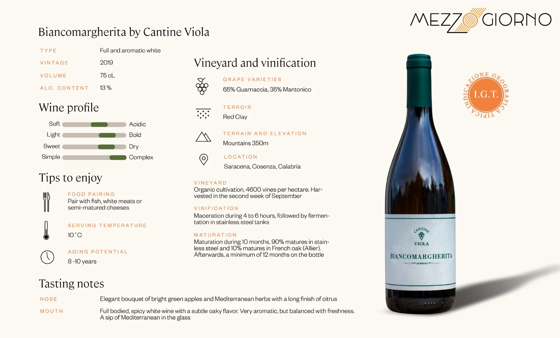 The Viola family uses native Mantonico grapes for Biancomargherita, a wine named after Luigi Viola’s wife Margherita. In this wine 35% of Mantonico grapes are combined with 65% of Guarnaccia Bianca. Mantonico grapes were introduced in Calabria by the Ancient Greeks 2500 years ago when they were imported during the colonization of the South of Italy. Guarnaccia grapes, on the other hand, have a Sicilian origin and are closely related to the French Grenache.