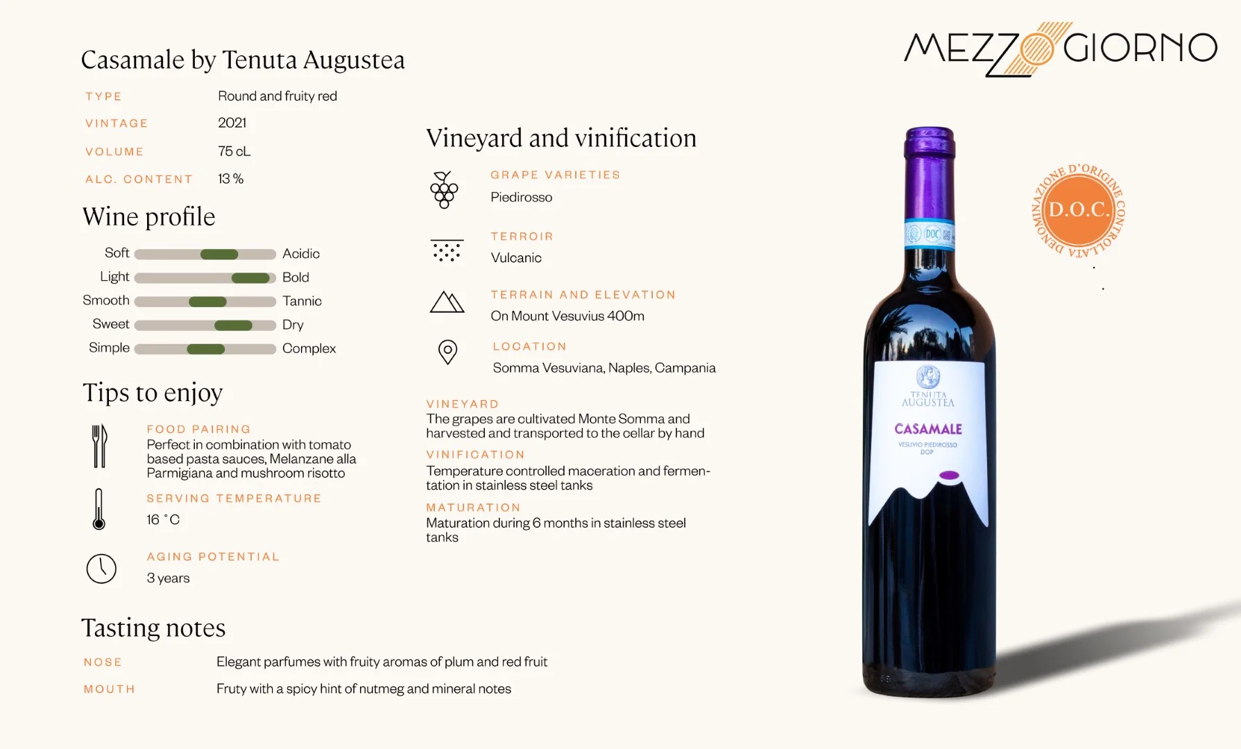 Marco Vincenzo's Piedirosso grows in the Vesuvius National Park and has been given the name Casamale, named after an old neighborhood in the village of Marco Vincenzo. This wine has deliberately not seen any wood. This emphasizes the subtle characteristics of the Piedirosso. The Piedirosso is not a grape as expressive as the Aglianico (see the red wines of Antonio Caggiano) which can mature for decades in the bottle. It is a grape with elegant perfumes, never too aggressive, with subtle tannins. Casamale is a full wine with fruity aromas of plum and red fruit with a spicy hint of nutmeg.