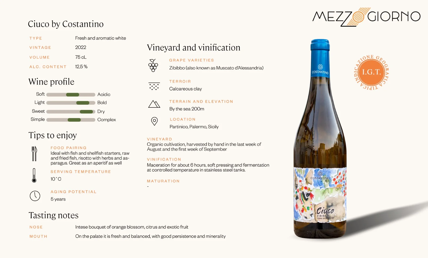 This wine is made from 100% Zibibbo grapes. This grape is also called the Moscato d'Alessandria because the grape originally comes from Egypt. The name Zibibbo most likely comes from the Arabic word zabīb, which means raisins. Traditionally, this grape is harvested late to make 'passito', an Italian dessert wine. Nowadays, the Moscato is used in no less than 15 DOCs in Italy, and also produces delicious dry wines.