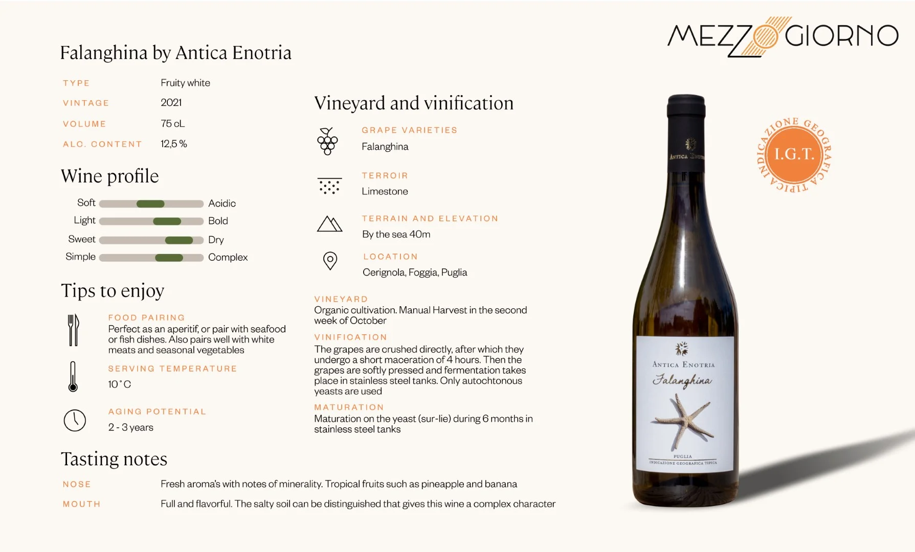The result is a beautiful organic wine with an intense yellow color and golden reflections. This Falanghina has a distinct floral aroma and a characteristic taste of tropical fruits like pineapple and banana. In this wine too, one can distinguish the salty soil and sea breeze that give this wine a complex character. The wine is full-bodied and juicy and does great as an aperitif, but is also well-paired with pasta, white meat and seafood dishes.