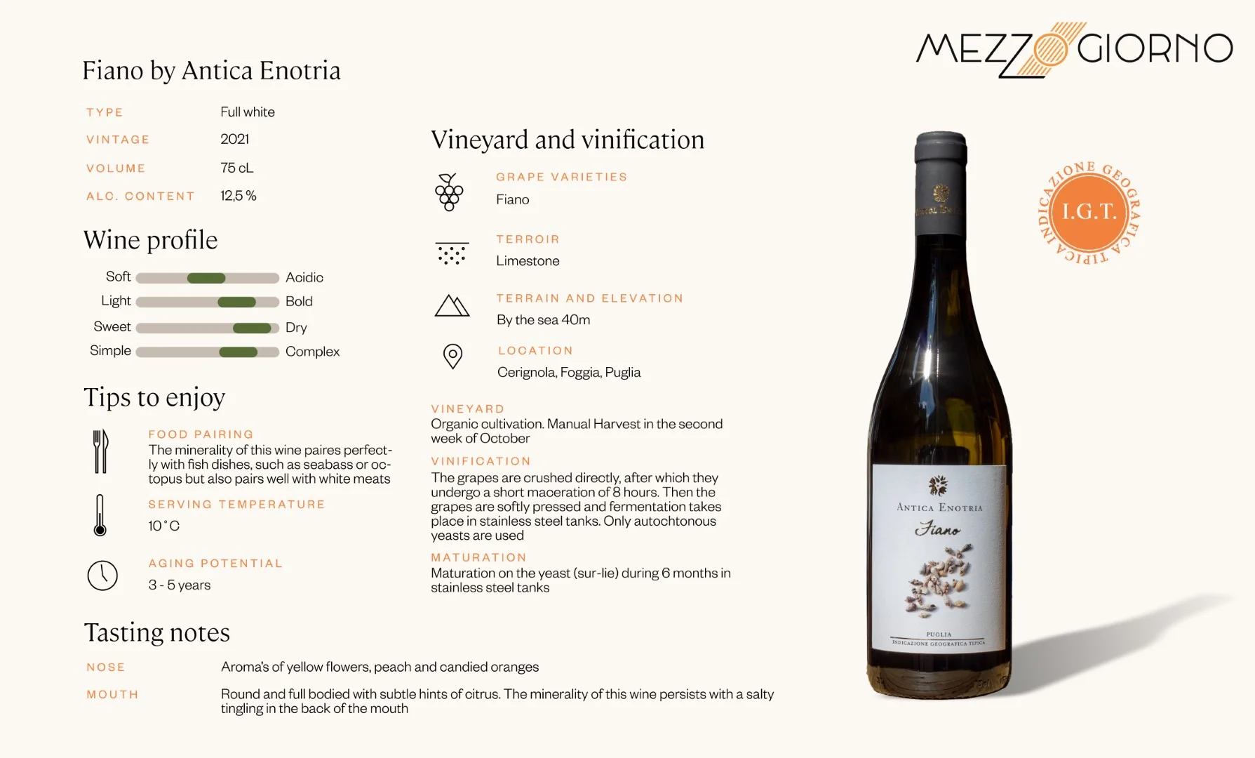 The result is an organic wine with an intense yellow color and aromas of yellow flowers, peach, and candied oranges. The taste is round and full-bodied with subtle hints of citrus. Creamy chicken dishes or pasta with pork pair well with this Fiano, but it is also extremely suitable to drink with various fish dishes and soups.