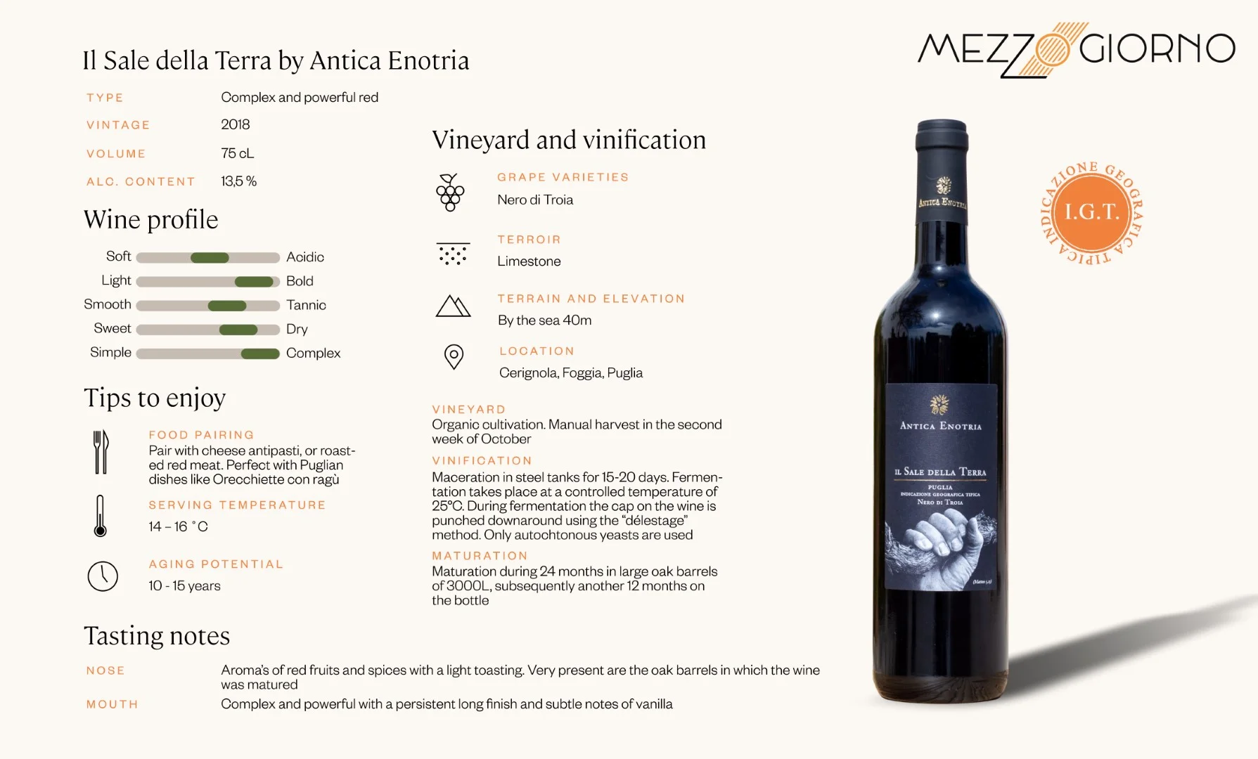 The fermentation of Il Sale della Terra takes place in stainless steel tanks, after which the wine is matured in large oak casks for 24 months. This wine embodies the land on which it was grown, it shows deep red colors with purple reflections and has elegant aromas of red fruit and spices. It is a complex, powerful wine with a persistent, long finish and subtle notes of vanilla. This wine pairs perfectly with grilled meats or a local favorite orrecchiete con ragu (pasta with Bolognese sauce), but it is also amazing just by itself for dreaming away without further distractions.