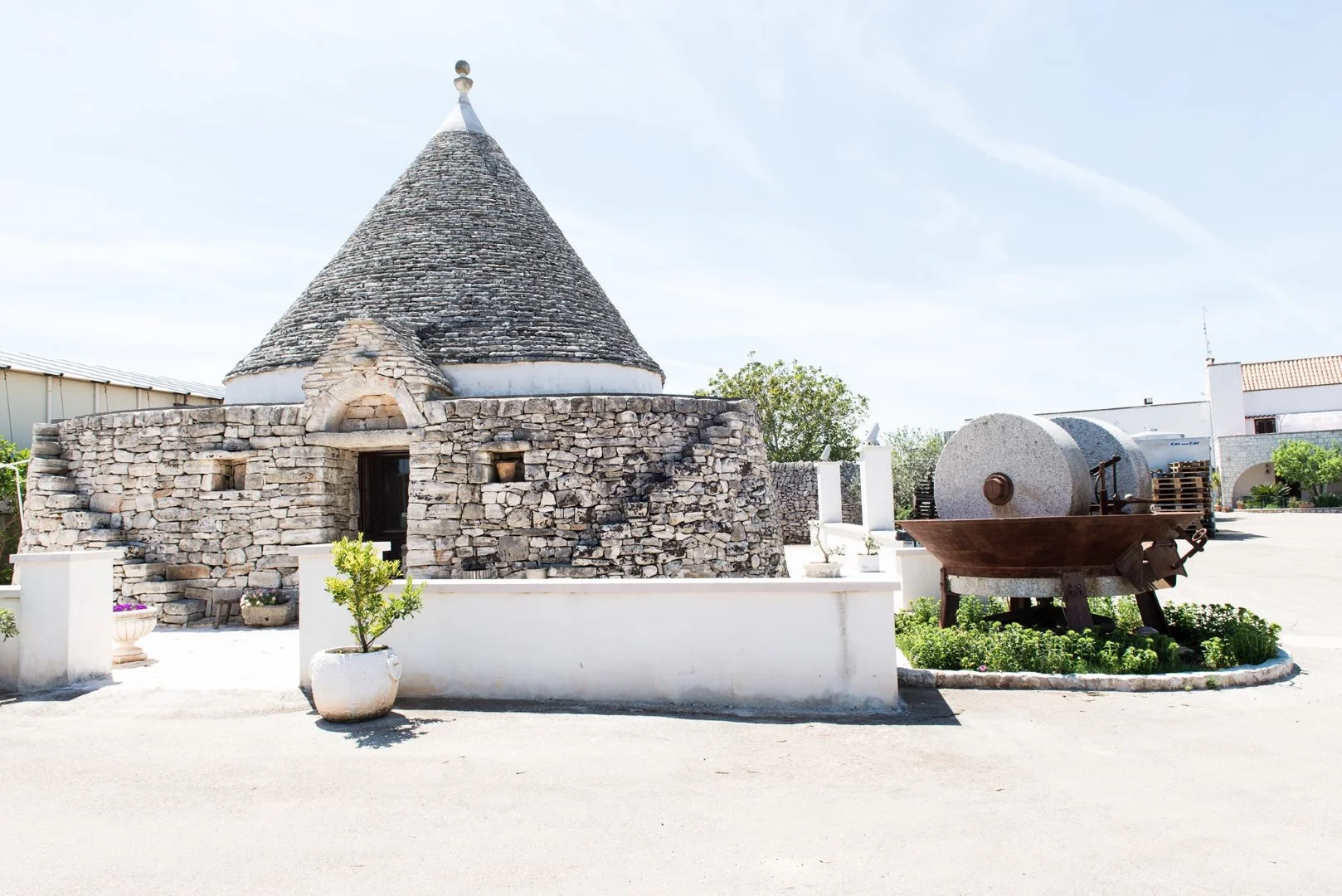 Antica Masseria Caroli is a family farm located in Martina Franca, a small town at the center of the Val d’Itria valley in Puglia. The valley is famous for its three-foot-tall white limestone walls and its characteristic Trulli, small white agricultural buildings with gray conically shaped roofs. Both the walls and the Trulli are built completely without cement and are held together purely by the design of the construction.