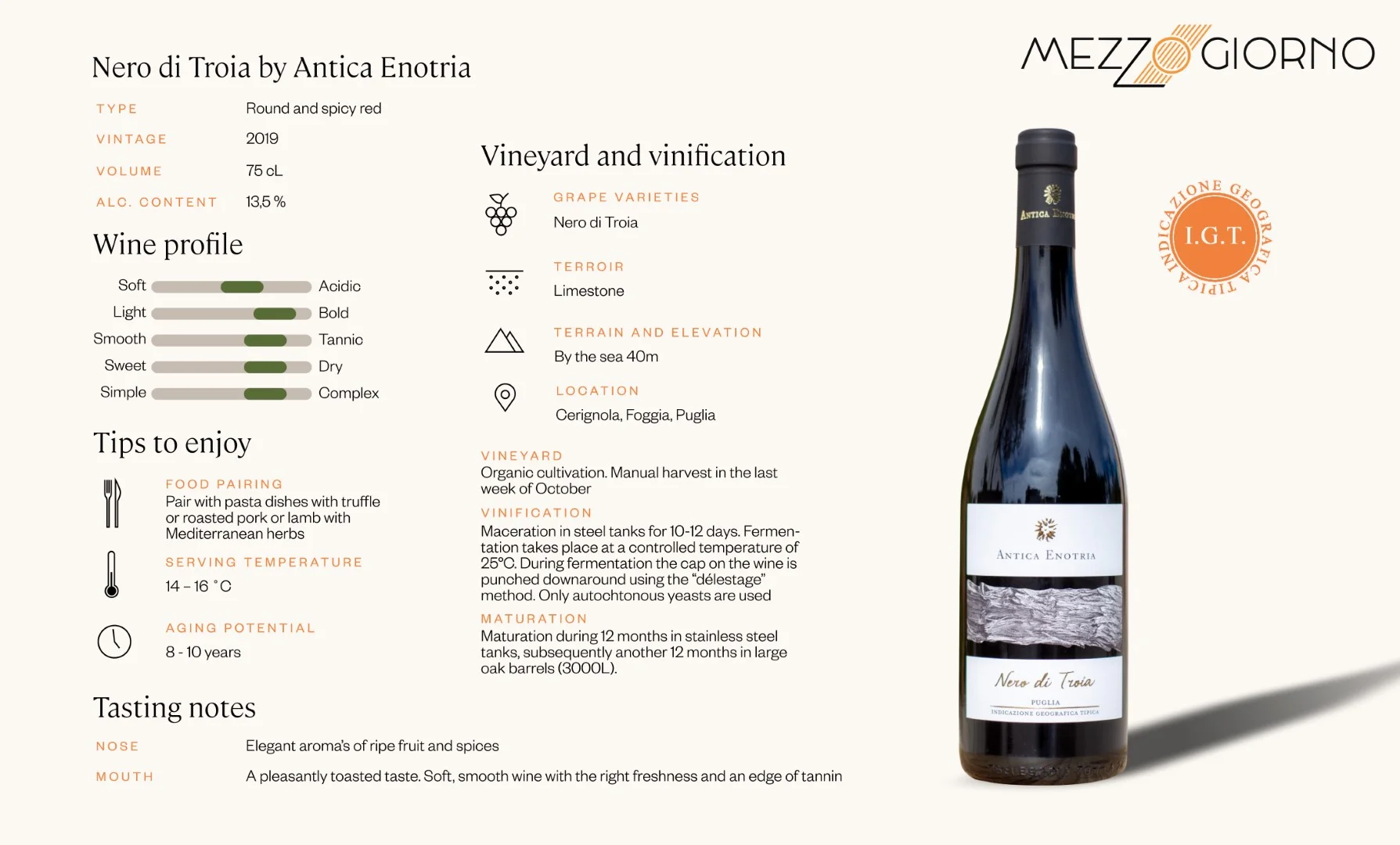 After the fermentation process, this organic Nero di Troia first matures in stainless steel tanks for twelve months and subsequently for twelve months in oak barrels. This wine embodies the land from which it was born, showcasing a strong deep-red color with purple reflections and elegant aromas of ripe fruits and spices. It is a soft, smooth wine with the right freshness and persistent long finish with an edge of tannin. This wine pairs beautifully with pasta dishes with truffle or roasted pork with Mediterranean herbs.