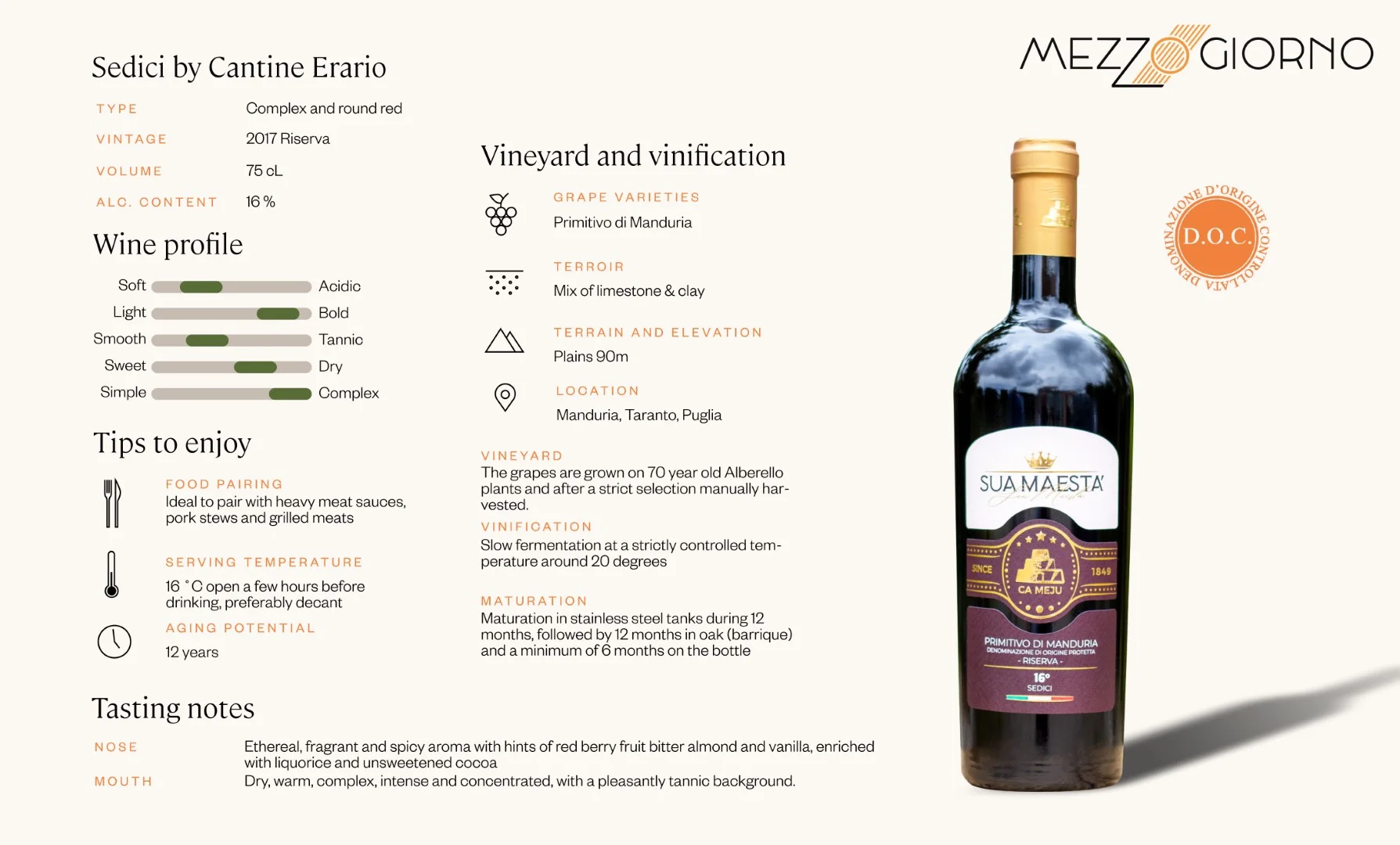 This Primitivo di Manduria DOC – Sedici (sixteen) Riserva is grown on 70 years old Alberello vines: free-standing, little trees instead of hanging plants in rows like we see in most vineyards. 3000 years ago, this was the way to cultivate grapes. Today, it is still practiced in very specific places. The method is less efficient, but with Alberello the grapes are sheltered from direct sunlight by the canopy of the small tree. In sun-drenched Puglia this is not a luxury. By protecting the berries against scorching and premature ripening, the grapes are given more time to form sugars. This allows Erario to achieve higher alcohol content during the fermentation process, resulting in a full, structured wine.
