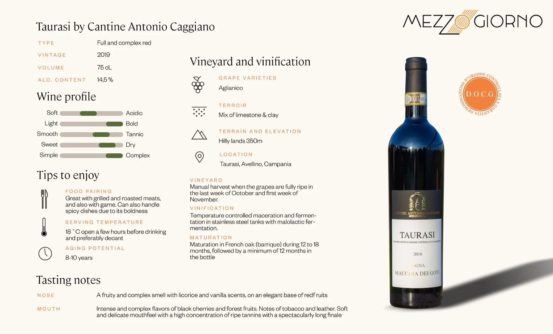 The Tausasi, affectionately called “the Barolo of the South”, is the absolute star of Giuseppe Caggiano and his father Antonio. Taurasi DOCG was the first appellation to receive the DOCG status in the South of Italy. So, if only because of this fact, it simply cannot be missing at Mezzogiorno.