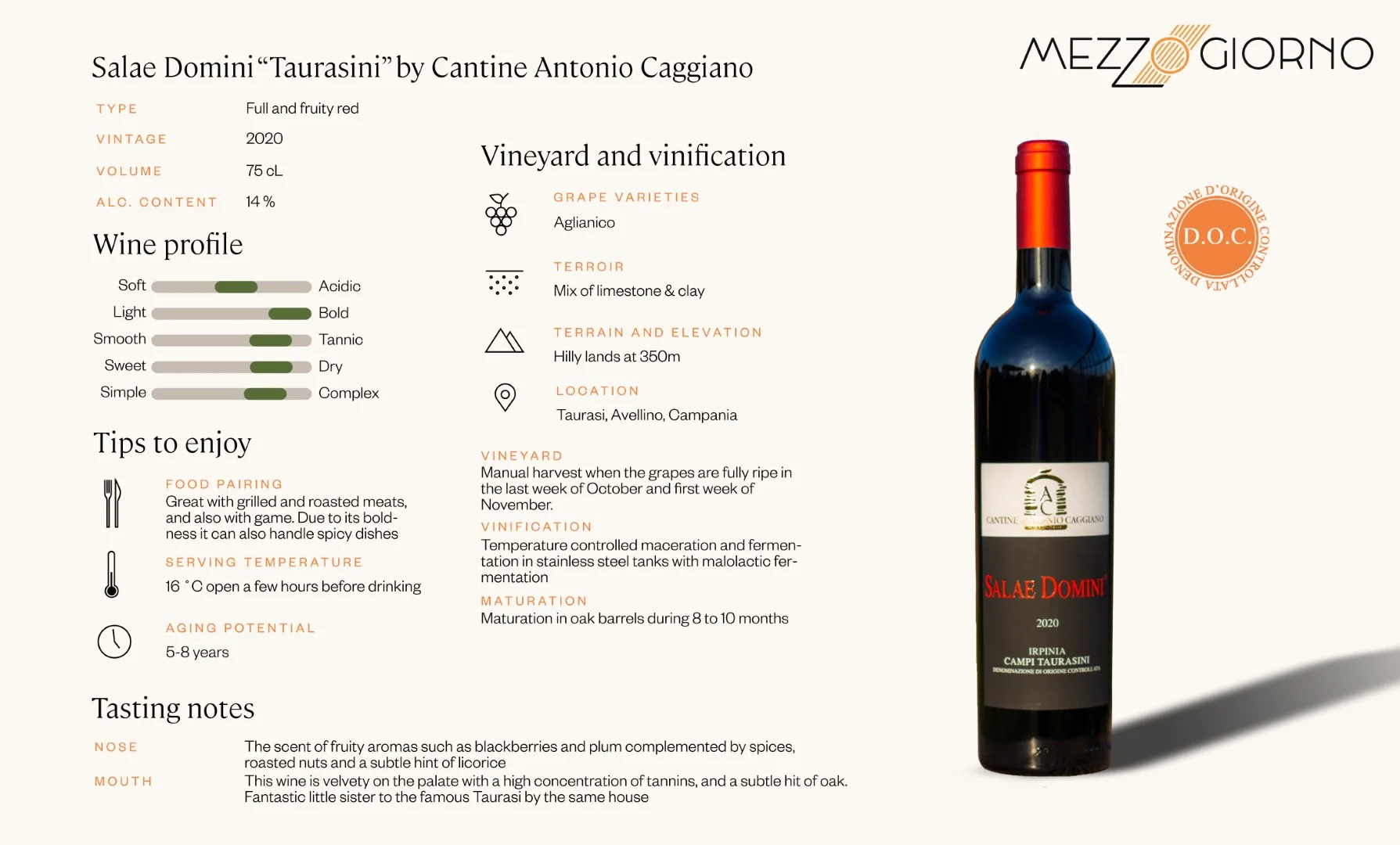 After harvesting, fermentation takes place in stainless steel, temperature controlled, tanks. Subsequently, the wine is aged for eight to ten months in barrique (oak barrels of 225L). Depending on the ripening process, the wine is bottled earlier or later. Compared to the more accessible Taurì, this Taurasini wine has gained more complexity from the longer period in the barrel.