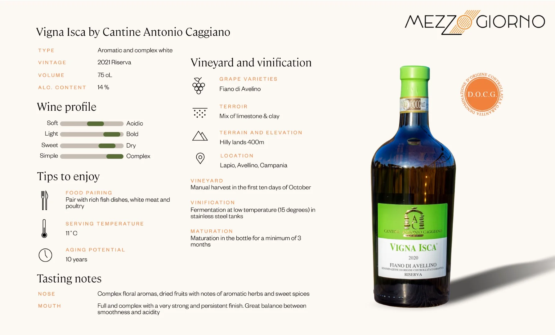 The result is a fantastic wine with complex aromas of flowers, dried fruits, and hints of spices. The taste of this golden-yellow wine is full, complex, and balanced with a strong and persistent finish. This Fiano is ideal to combine with rich fish dishes, white meat and poultry.