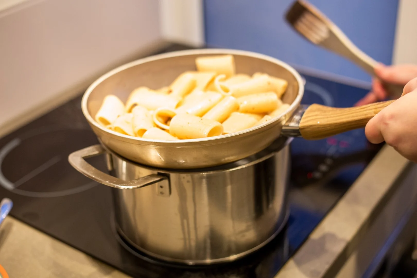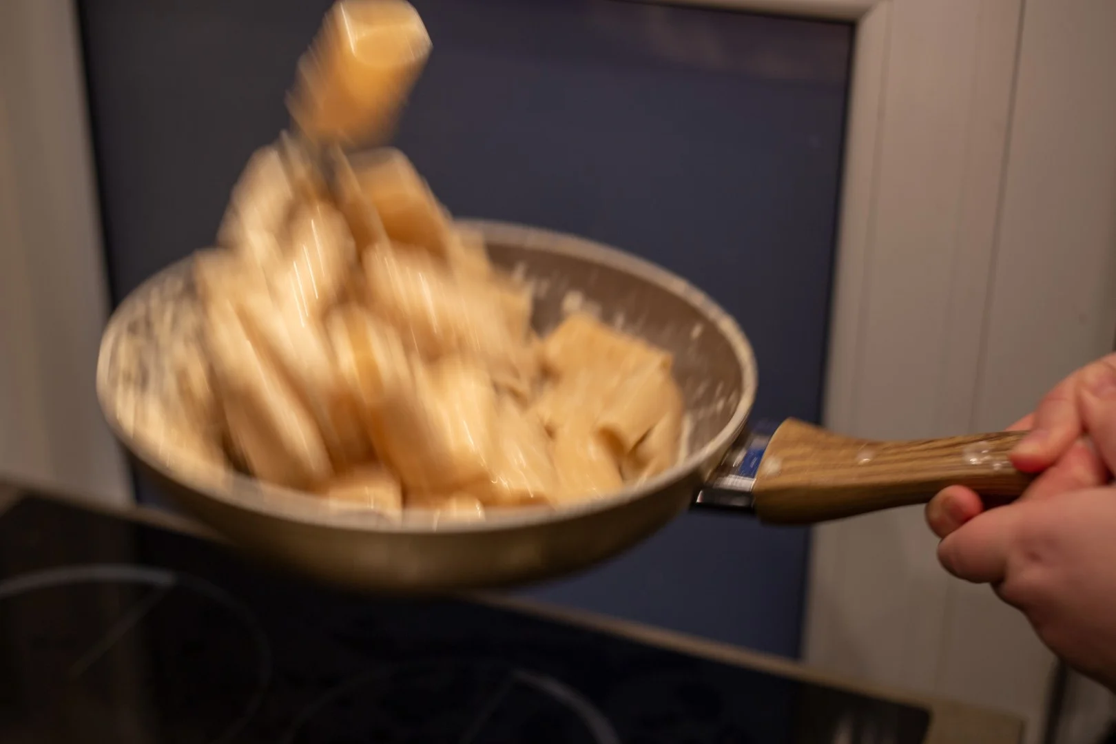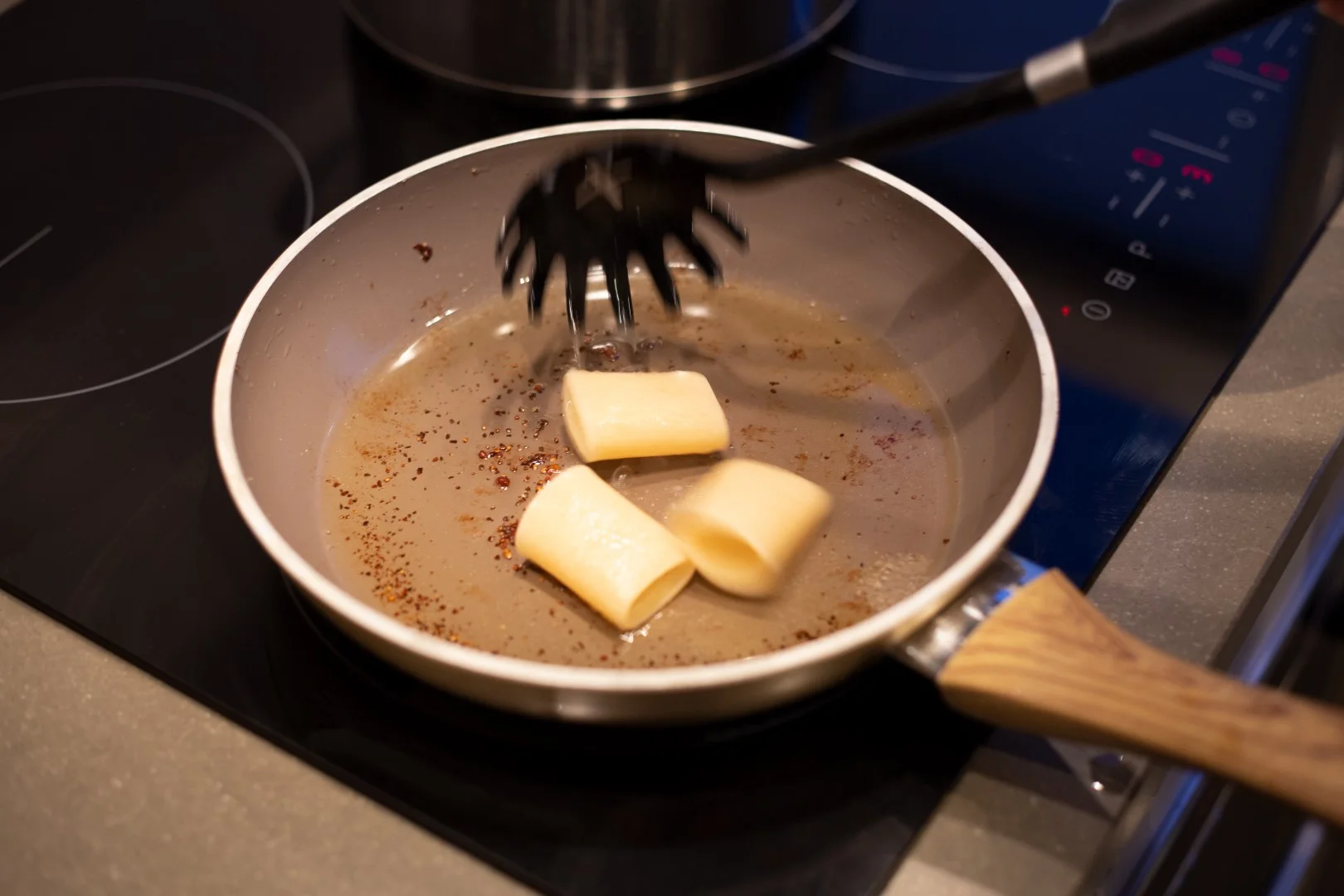 Place the skillet on the high pan and ensure that the pasta water is boiling. By mixing the pasta au bain-marie in the skillet with pecorino and pasta water, you can prevent the cheese from melting too quickly and becoming stringy. If you see signs of stringy pecorino, remove the skillet from the heat source at the first indications and let it cool briefly while stirring or tossing mixture before continuing with the recipe.