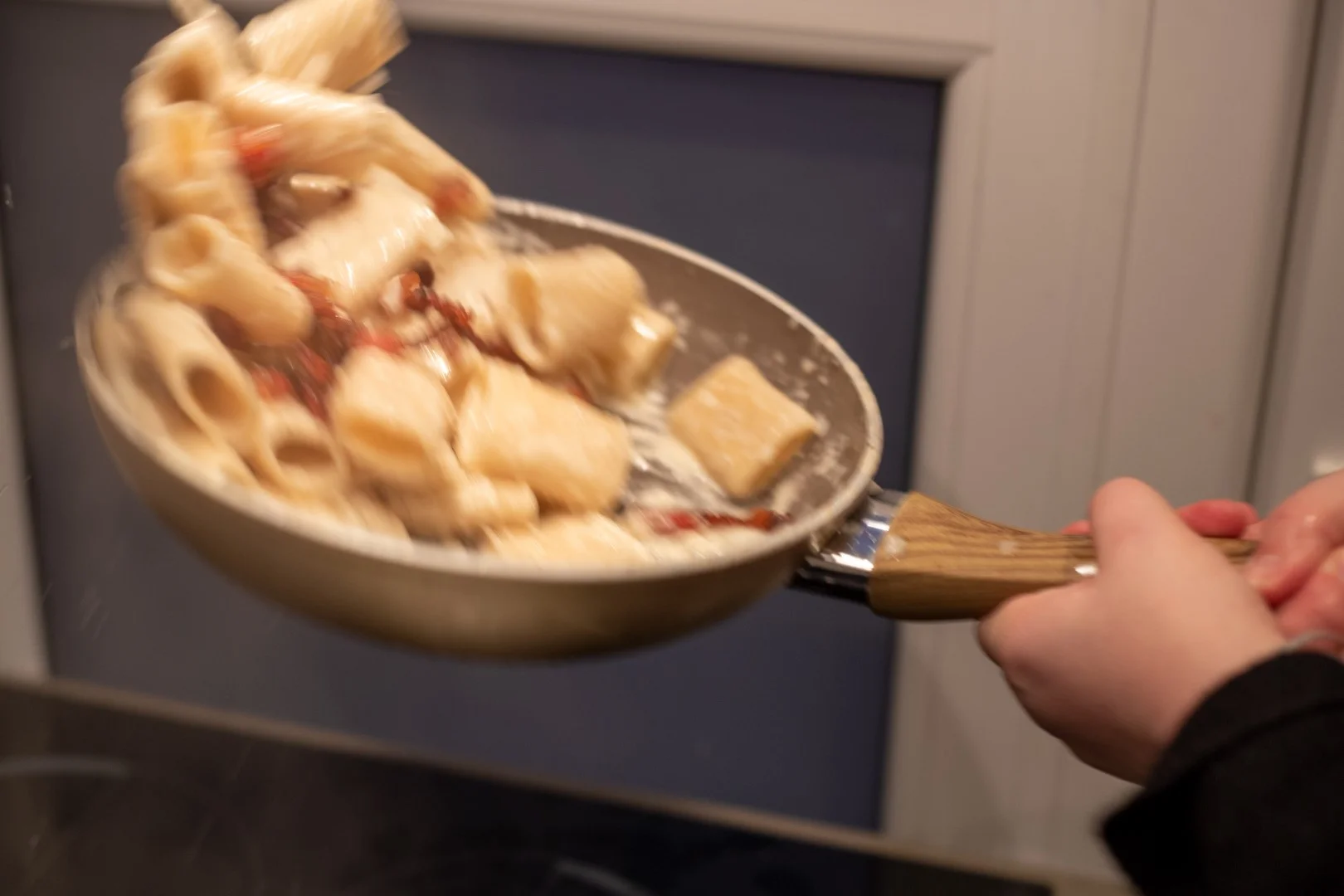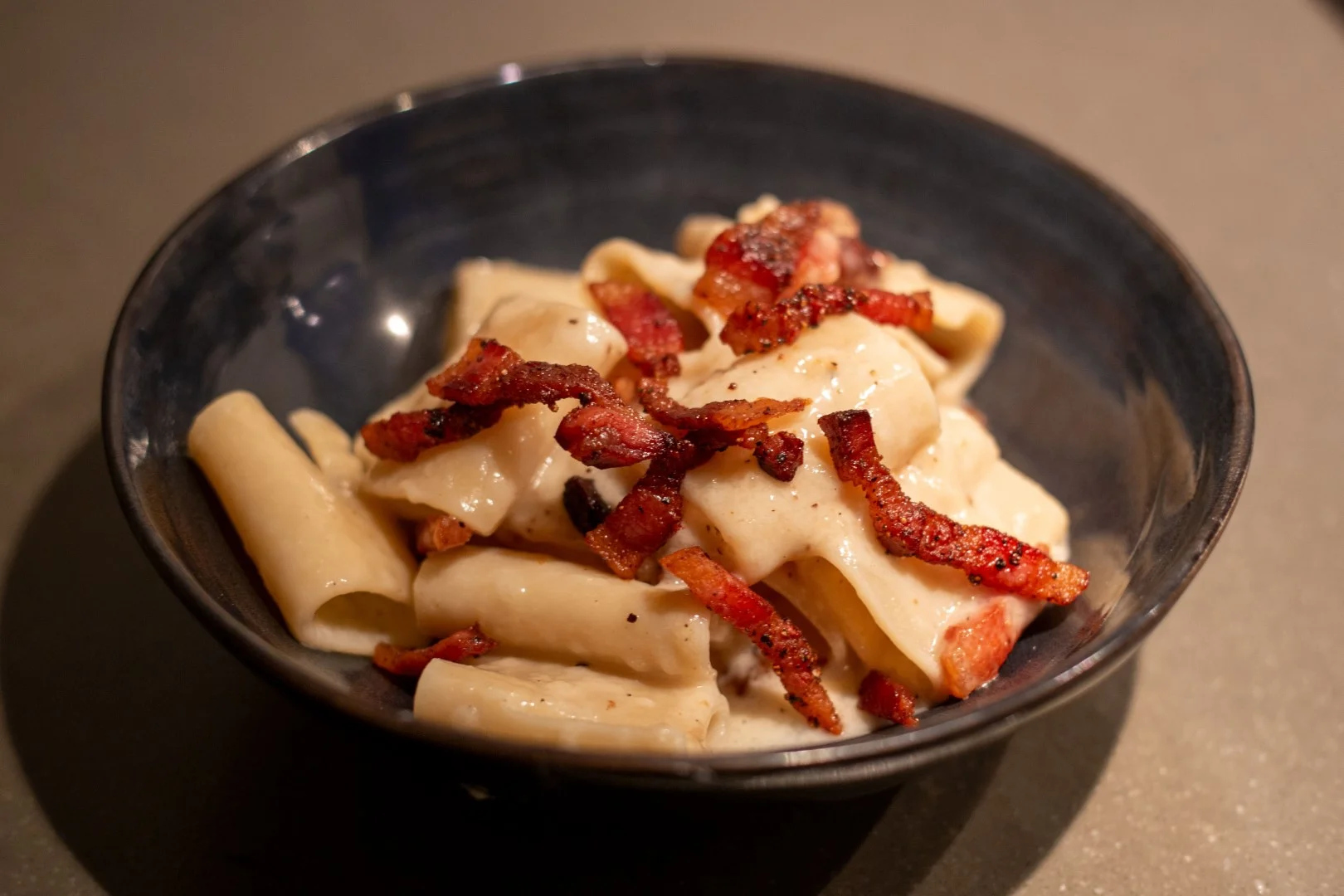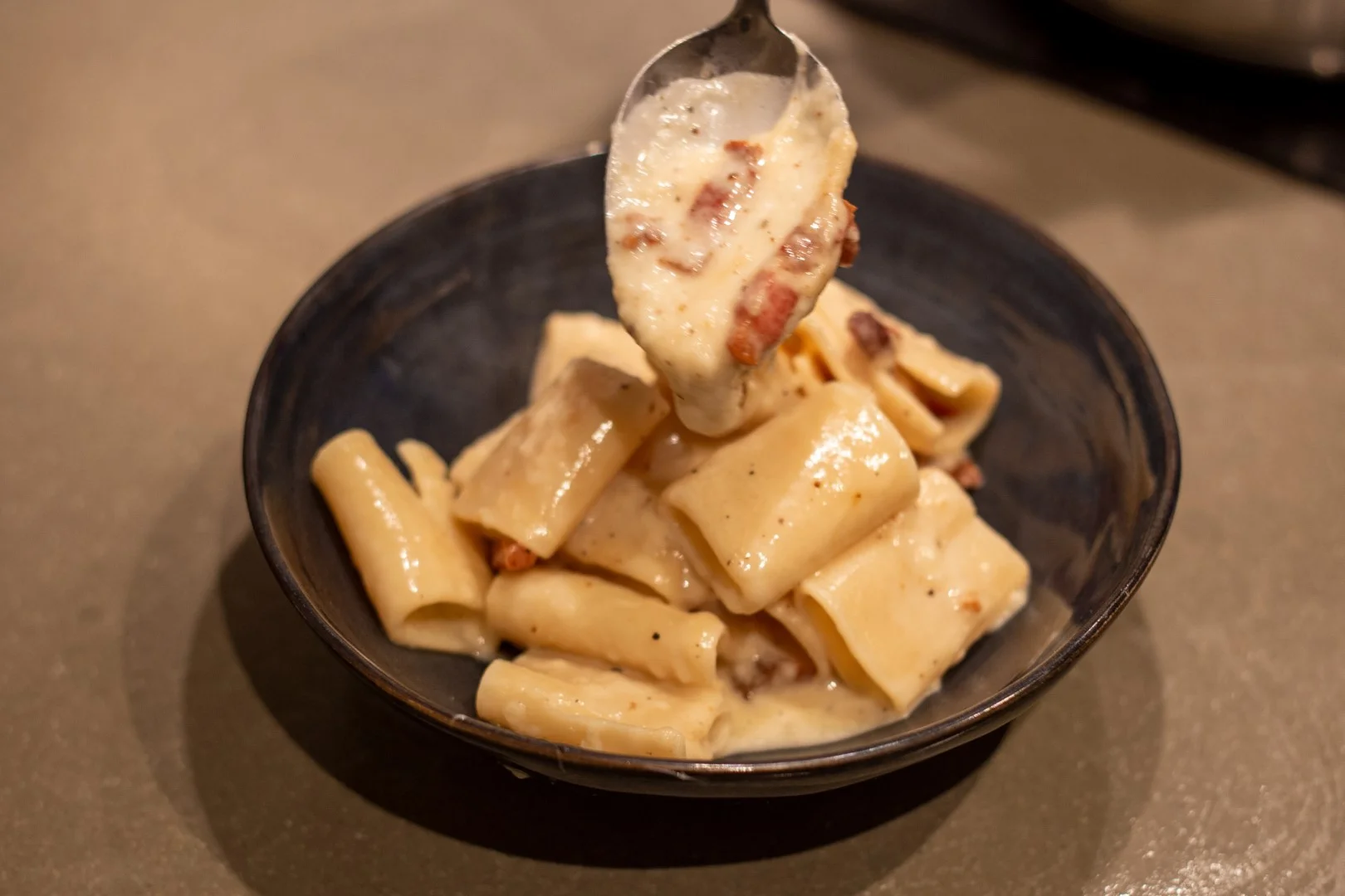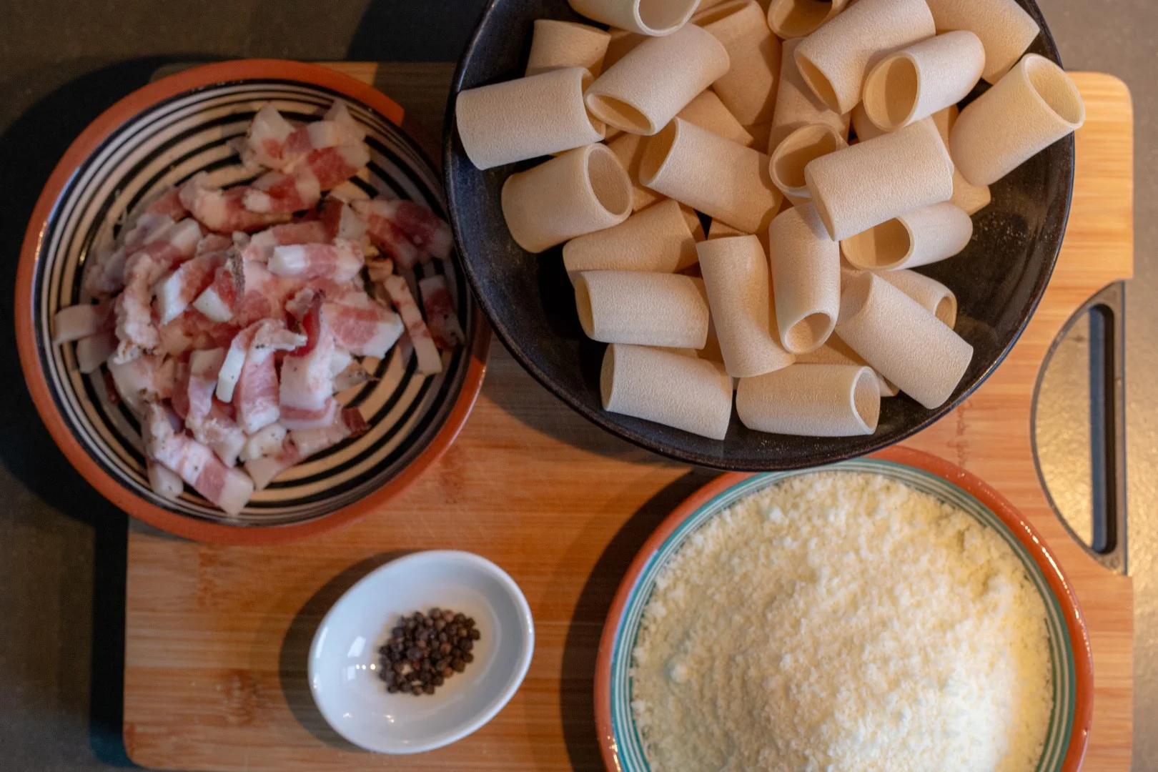 Italians always have an opinion on the shape of the pasta. Strands, ridges, tunnels, or thickness – according to Italians, it is crucial to match the pasta shape to the sauce. Alla Gricia is usually eaten with Mezze Maniche (half rigatoni), Rigatoni, or Paccheri. These are all forms of tubular pasta where the guanciale can nestle inside. In this recipe, we use the wonderfully thick Paccheri from Castellano.