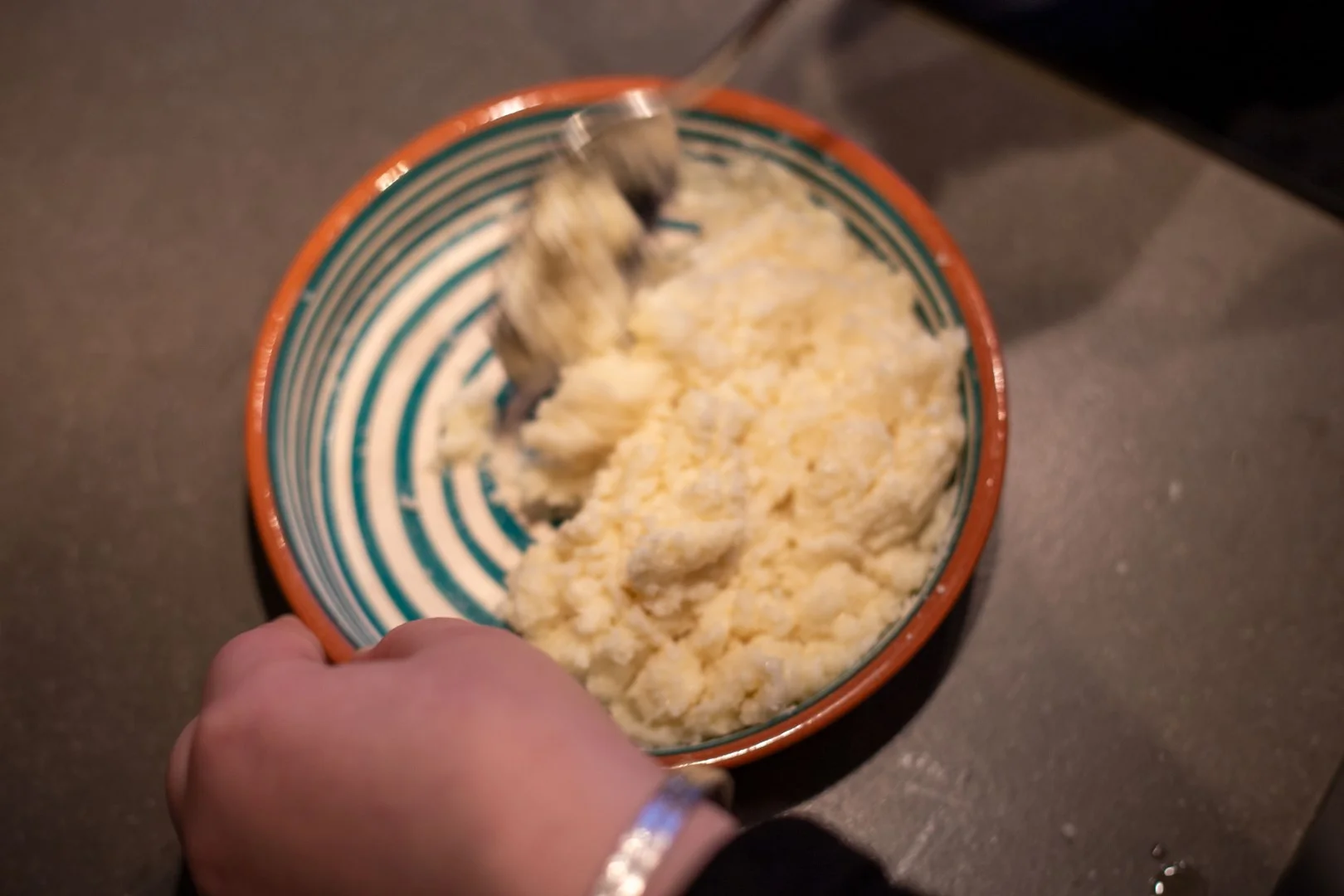 Add a tablespoon of the guanciale fat to the pecorino. Then, add small amounts of pasta water and stir until a thick, grainy paste forms. Add the other half of the teaspoon of pepper to the pecorino paste.