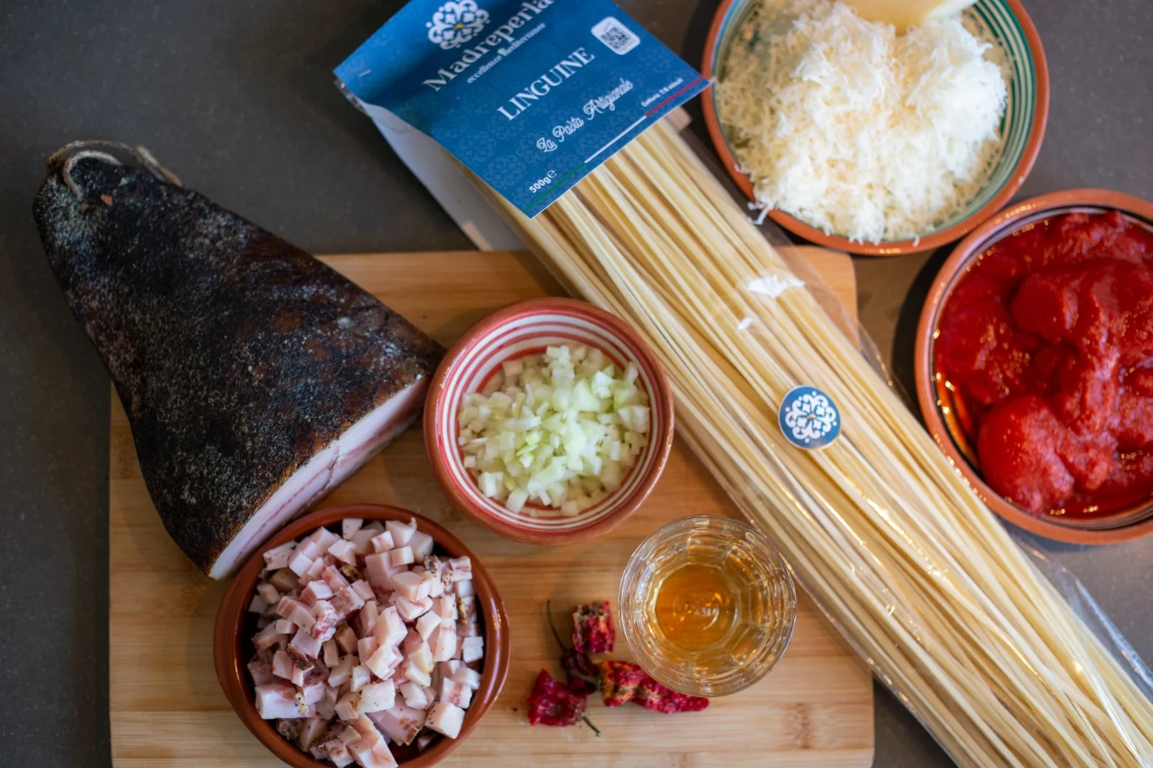 Originally, the residents of Amatrice made their Amatriciana with spaghetti. Due to the annual migration of shepherds between Abruzzo and Lazio (the region where Rome is located), the dish became popular there as well. Some adaptations followed. Romans added onions and made the recipe with bucatini, a pasta shape similar to spaghetti but hollow on the inside. We make our Amatriciana with the extra-long linguine from the Castellano family and Francesco's guanciale, a delightful combination!