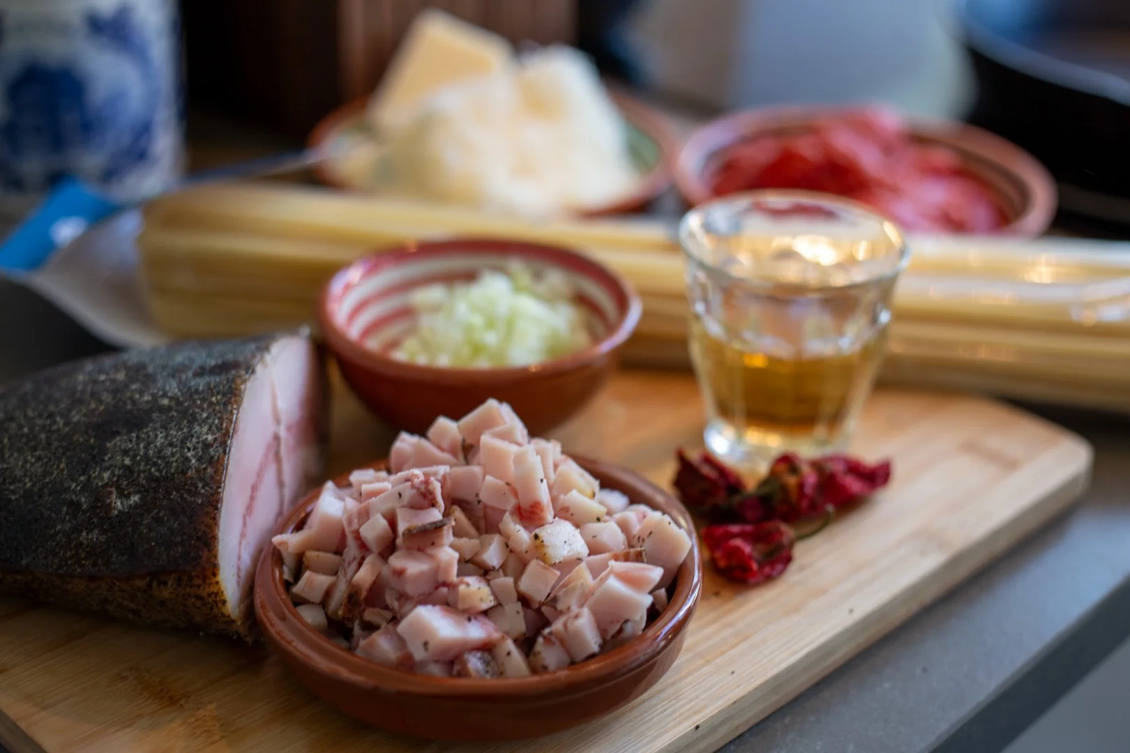 Ultimately, spaghetti all'Amatriciana, the original recipe, became national cultural heritage in Italy. The municipality of Amatrice has the official recipe on its website. It describes that the ratio of guanciale to spaghetti should be 1 to 4. They say this ratio is sacred! Although we would never dare to deviate from centuries-old Italian traditions, Francesco's guanciale is so incredibly delicious that we can't help but add a little extra. In our recipe, you'll find a 1 to 3 ratio. Please don't tell the shepherds from Amatrice!