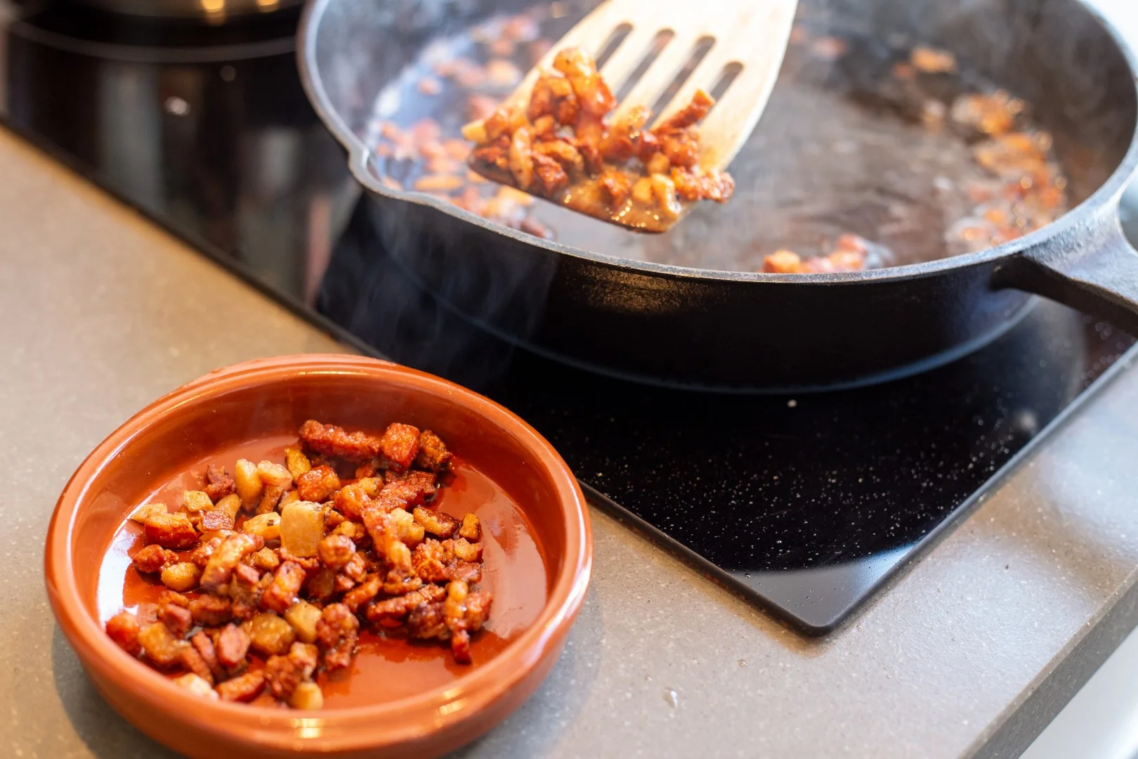 Using a spatula, remove the guanciale cubes from the pan and set them aside in a bowl. The fat from the guanciale should remain in the pan. Reduce the heat and sauté the onion (if you add it) and the chopped chili pepper (or chili flakes) in the fat.