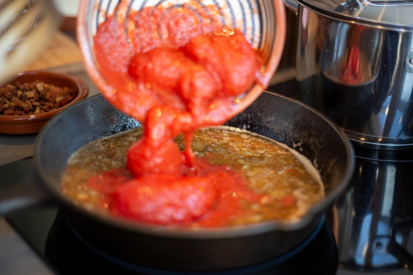 Deglaze the pan with white wine. Bring the wine to a boil while stirring and let it simmer for a while (2 minutes). Then, add the canned peeled tomatoes. Crush the tomatoes and stir to create a coarse red sauce. Reduce the heat and let the sauce simmer (10 - 15 minutes).