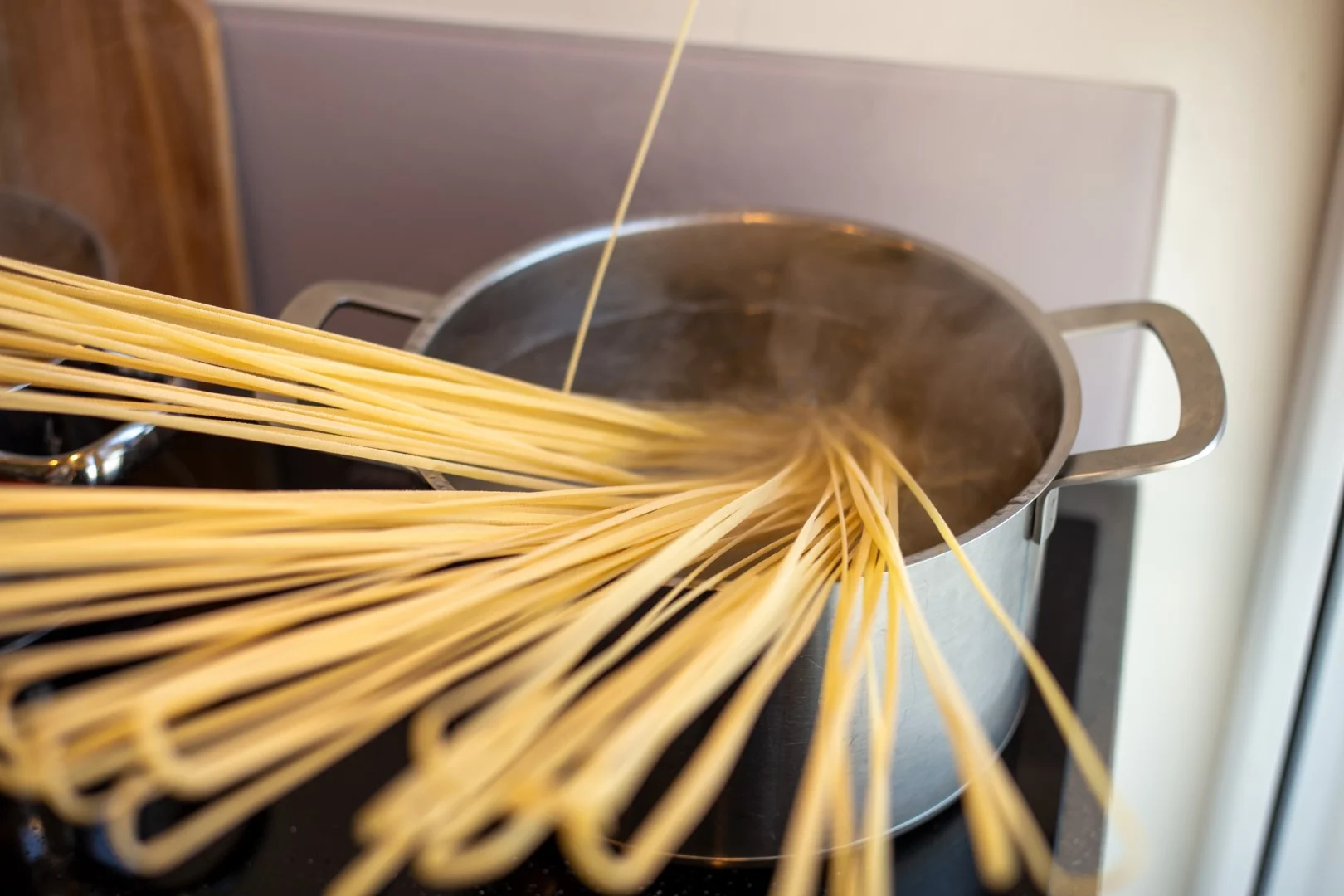 Add plenty of salt to the pasta water. Cook the linguine for two minutes less than the package instructions state. Meanwhile, grate the pecorino with a fine grater. Keep an eye on the pasta sauce. If it seems to be drying out, you can add a splash of pasta water to it.