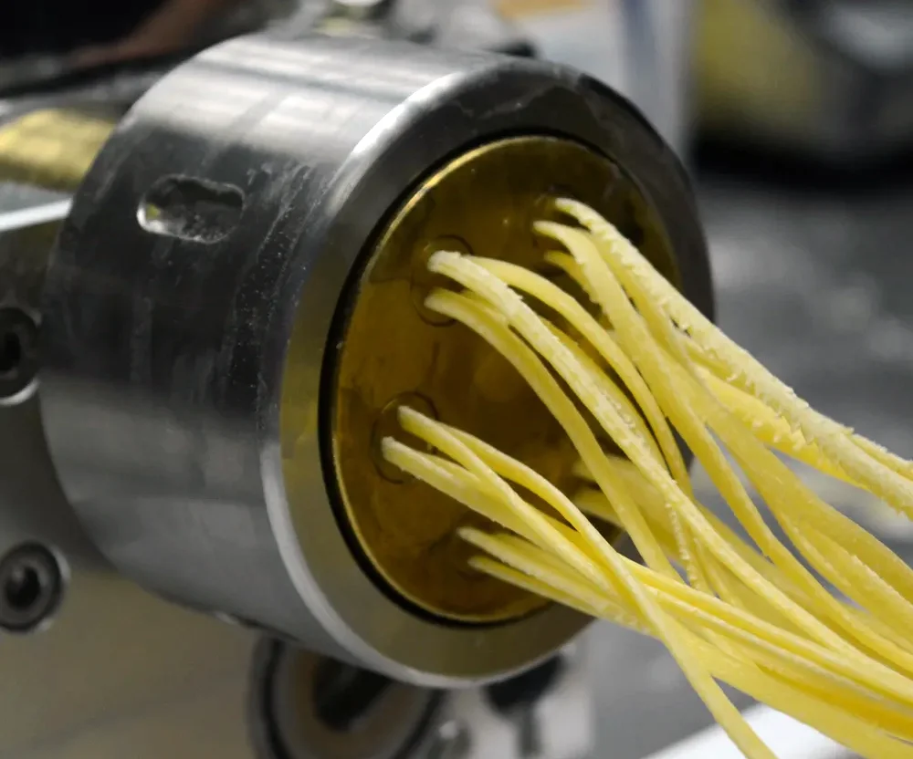 The dough for the pasta consists of only the family’s durum wheat semolina (a slightly coarser grinding of the wheat) and water. The dough is thoroughly kneaded to form gluten, which give the pasta its shape and bite. After a short resting period, the dough is pressed through a bronze die. High quality extruded pasta should always be extruded through bronze, giving the pasta its rough exterior. This roughness gives the pasta its ability to cling to the sauce. Then, the pasta is slowly dried for 24 hours at low temperatures. This step is crucial to maintain the proteins in the pasta. The long drying phase is a big difference with industrial pasta you will find in supermarkets. It gives artisanal pasta its characteristic light yellow, almost white color instead of the much darker yellow that we see with many pasta brands in the supermarket.