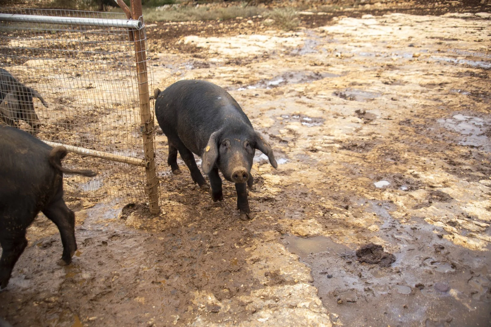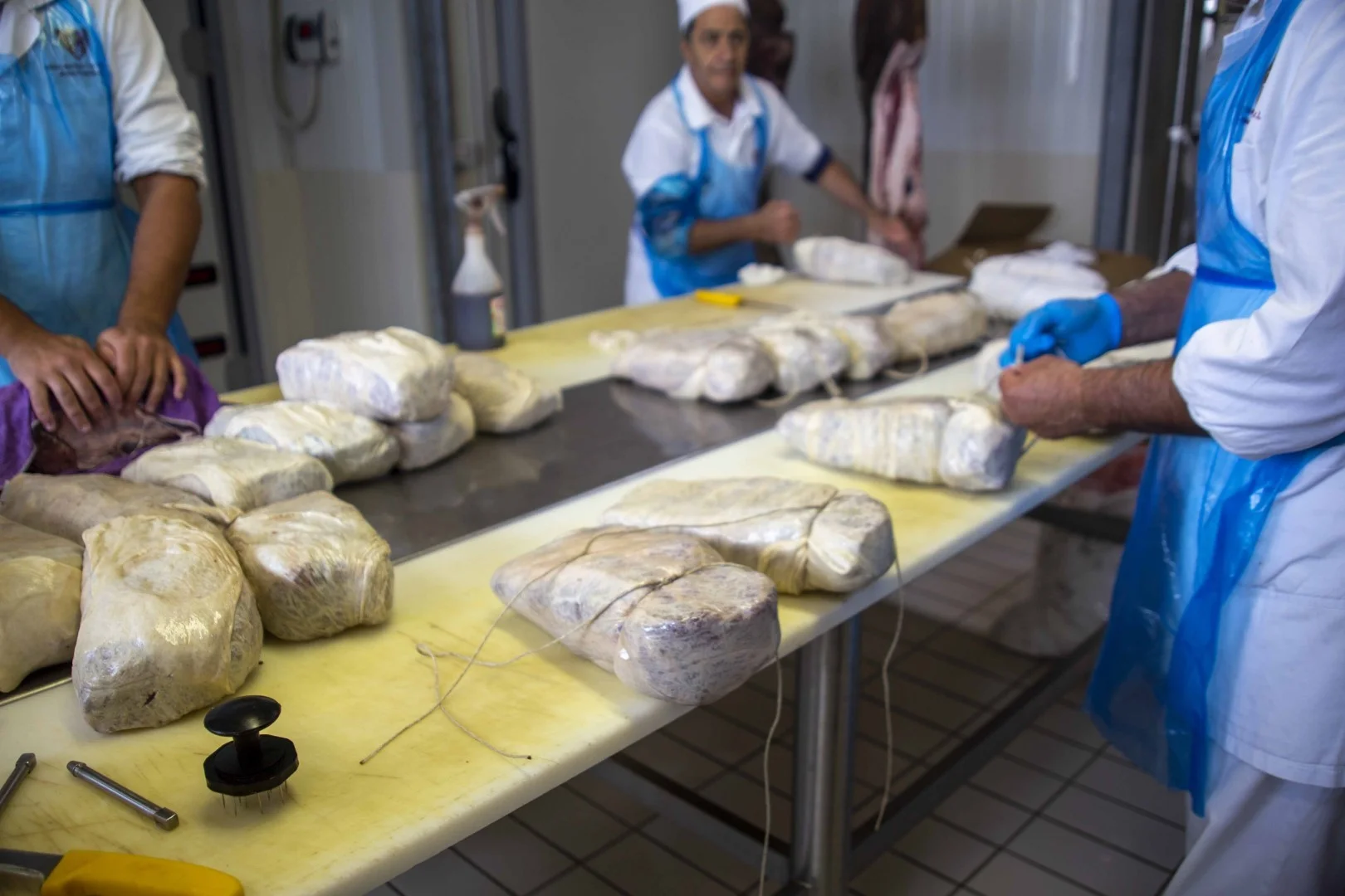 When we arrived at the house where owner Stefano was born, we were shown around the pig farm. He showed us his 300 black pigs rummaging around between the olive trees. These pigs are of the Nero Pugliese type, an indigenous black pig breed. Stefano then took us to the stables, where the little pigs were nursing with their mother. After a short drive, not far from Stefano's birth home, we arrived at the salumificio. Here, the pigs are processed into cured meat products. We were shown around by Stefano's son-in-law, Francesco.
