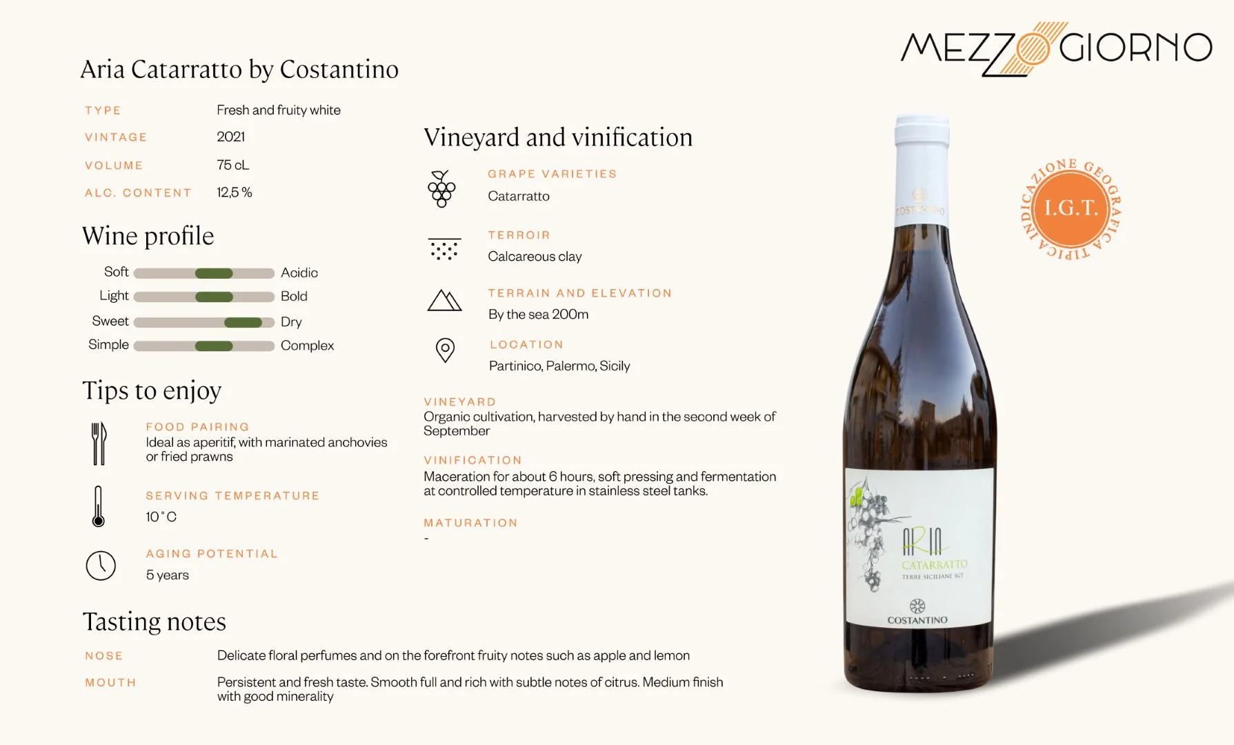 De inheemse Catarratto is een druif die hoofdzakelijk terug te vinden is in het westen van Sicilië, tussen Trapani en Palermo. Zo ook in de wijngaarden van Costantino, niet ver van de mediterrane noordkust van Sicilië. Ondanks dat deze druif vooral op Sicilië te vinden is, is het de tweede witte druif van Italië.