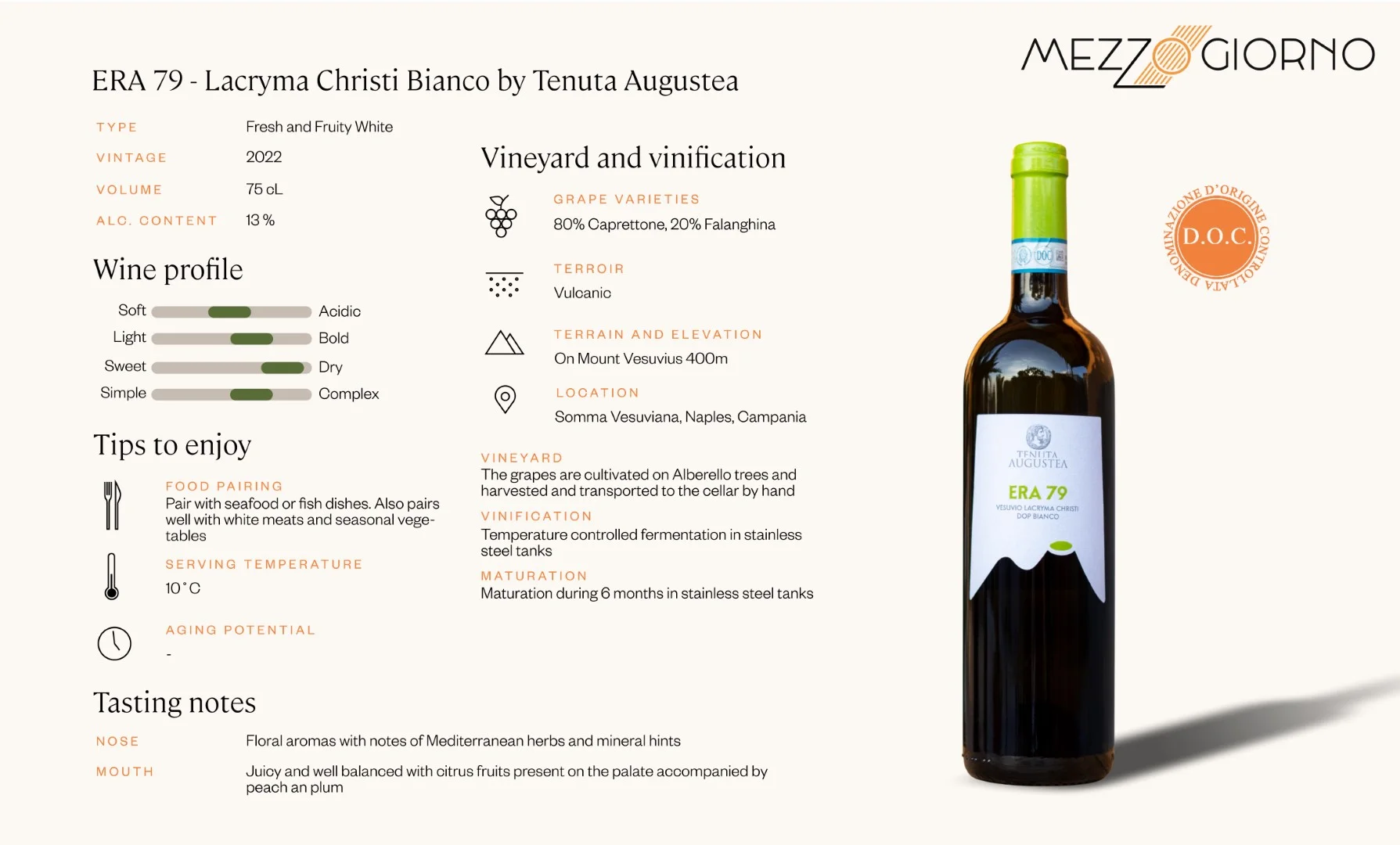 In 79 voor Christus barstte de Vesuvius uit, waarmee Pompeï, Herculaneum en vele andere Romeinse dorpen werden verwoest. Met deze uitbarsting werd ook een nieuwe lava-toplaag gecreëerd waarop vandaag de dag de druiven van Marco Vincenzo groeien. Dit was ook de reden om deze wijn, en haar rode zusje, ERA 79 te noemen.