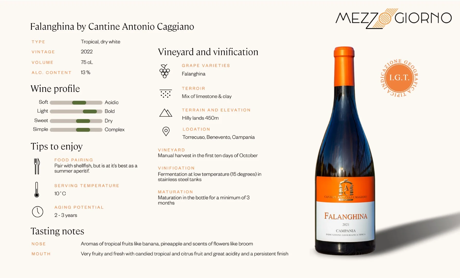 Met deze wijn geniet je van een neus van tropisch fruit. In de mond heeft deze Falanghina de kenmerkende tonen van banaan met goede zuren en een aanhoudende afdronk. Deze fruitige en frisse en droge wijn combineert uitstekend met vis en schelpdieren maar ook zeer geschikt als aperitief.