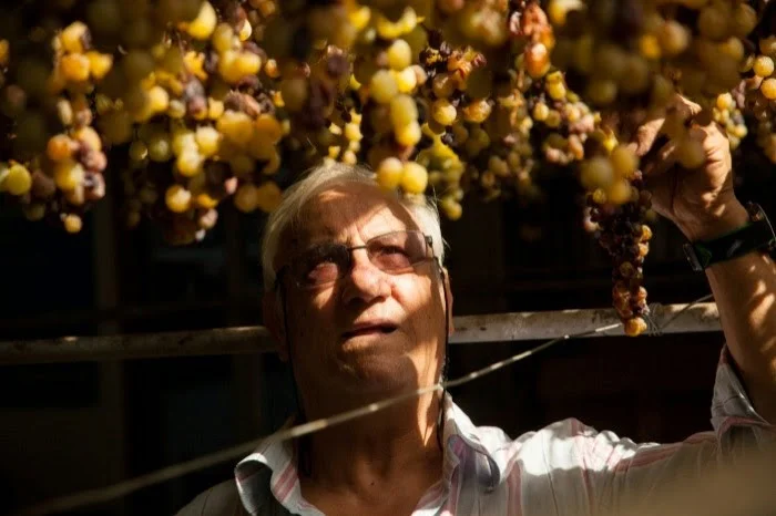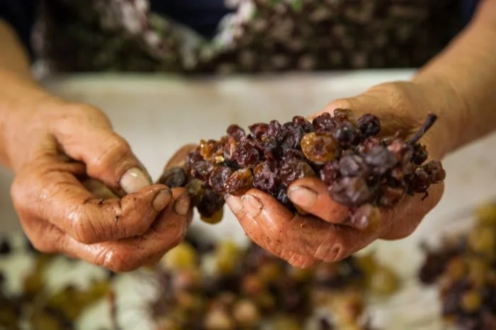 Daarna worden de gedroogde Moscatello en Adduroca druiven met de hand van de trossen geplukt, met de hand geperst en bij de gecondenseerde most gevoegd. Geactiveerd door de natuurlijke gist van de gedroogde druiven begint het lange fermentatieproces gevolgd door een rijping van zes maanden.