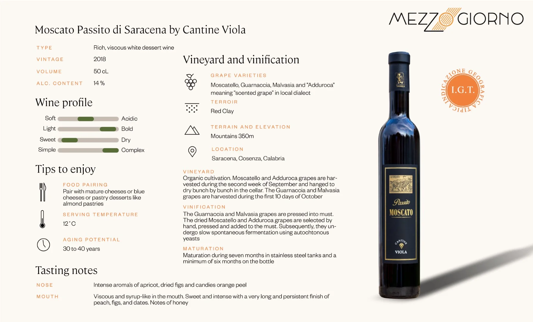De Moscato Passito di Saracena is de reden dat Luigi Viola in 1999 begon met het wijnhuis Cantine Viola. Na zijn pensioen was Luigi vastbesloten om zijn dorpje Saracena, midden in het Pollino nationaal park, opnieuw op de kaart te zetten. Al in de 16e eeuw werd deze wijn gemaakt en in 1901 werd hij in het boek “By the Ionian Sea” als volgt beschreven: “Ik herinner me alleen, als enige de moeite waard in Sybaris, een smakelijke witte wijn genaamd Moscato di Saracena”.