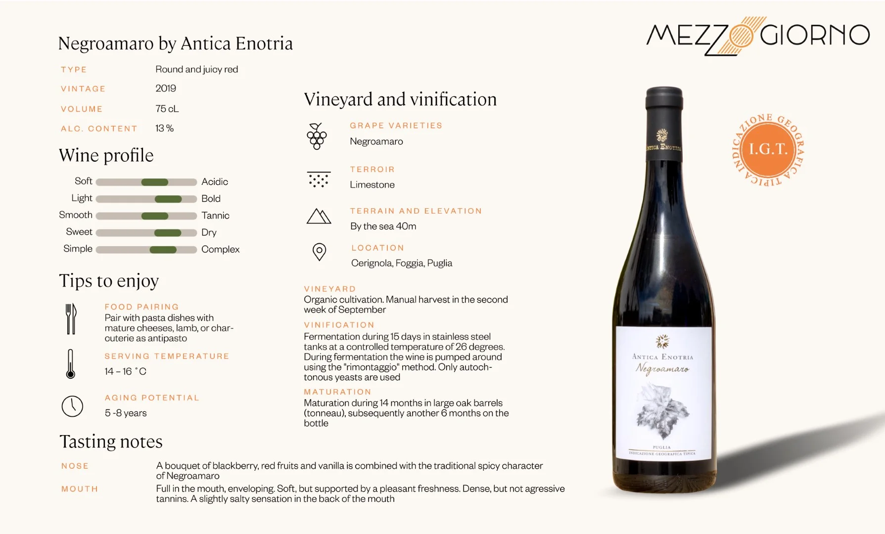 In veel gevallen wordt de Negroamaro gebruikt in een blend met andere druiven. Luigi, de eigenaar van Antica Enotria doet dat zelf niet. Door de druif niet te mengen met andere rassen kan hij beter begrijpen welke factoren in het vinificatieproces een rol spelen bij de smaakontwikkeling van zijn Negroamaro. Deze wijn rijpt op eikenhoutenvaten tussen de 8 en 14 maanden waarna ze gebotteld op de fles nog 6 maanden blijft rusten.