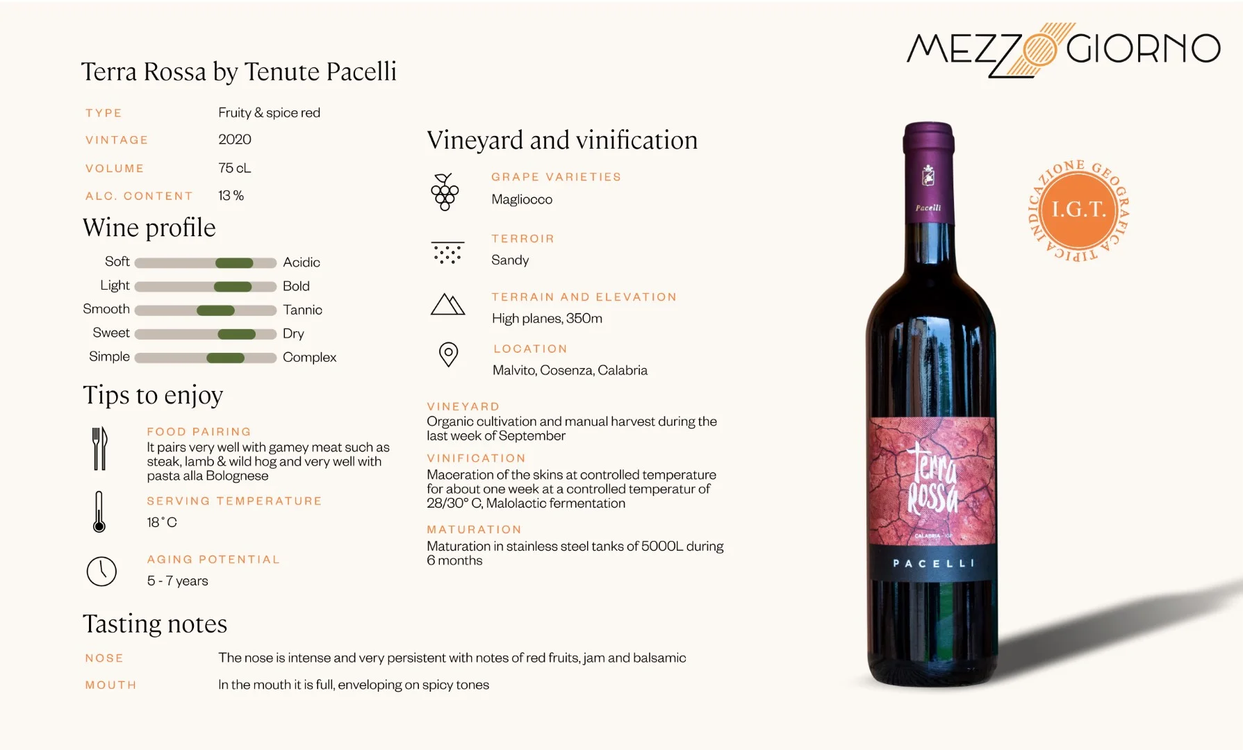 Terra Rossa (rode aarde) refereert aan het terroir waar de druiven op zijn verbouwd. Tenute Pacelli kent een rijke hoeveelheid aan verschillende terroirs. De Magliocco ranken, die verantwoordelijk zijn voor deze wijn, staan op de rode, kleiachtige grond. De rode kleur verklapt dat deze grond buitengewoon rijk is aan ijzer en mineralen, ook van de aanwezige kalksteen.